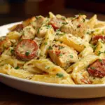 A delicious and creamy pasta dish featuring chicken, sausage, and pepper jack cheese, perfect for a comforting meal.