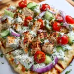 Picture this: golden-brown flatbreads, baked until they elegantly crisp up at the edges, then generously layered with juicy, succulent chicken, and an abundance of colorful toppings. Every bite bursts with flavor—the tangy crunch of cucumbers, the sweetness of ripe cherry tomatoes, and the sharp, salty notes of feta weave together in a delightfully satisfying medley. This is not just a meal; it is an experience, a delicious nod to the sun-drenched shores of Greece, beautifully served on your dinner table.