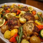 A simple and delicious one-pan meal featuring herb roasted chicken thighs, colorful veggies, and tender potatoes, perfect for a weeknight dinner.